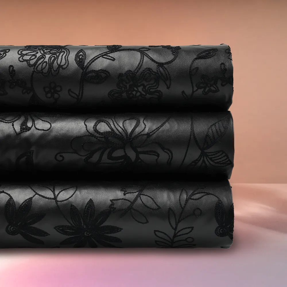 Embroidery meets leather for a fresh take on a classic. Washed Embroidery Vegan Leather: a new winter essential. This article is available in three floral designs, all in black. The subtle tone-on-tone embroidery creates an elegant, textured effect. This vegan leather is very supple and has a luxurious feel. Think about making statement jackets and coats, chic black leather skirts, or unique floral pieces. A chic choice for bags or other accessories.